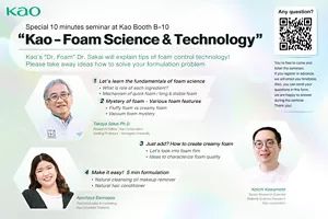 และสารอื่นๆอีกมากมายที่ใช้ได้ทั้งใน Personal care และ Household care ซึ่งได้รับความสนใจจากผู้เข้าร่วมงานเป็นอย่างมาก รวมถึงยังได้จัด Mini-seminar ในหัวข้อ "Kao-Foam Science & Technology" โดยมีผู้เชี่ยวชาญจาก Kao Corporation และ Kao Industrial (Thailand) Co., Ltd เป็นผู้บรรยาย ให้ความรู้และเทคนิคด้านต่างๆ ดังนี้